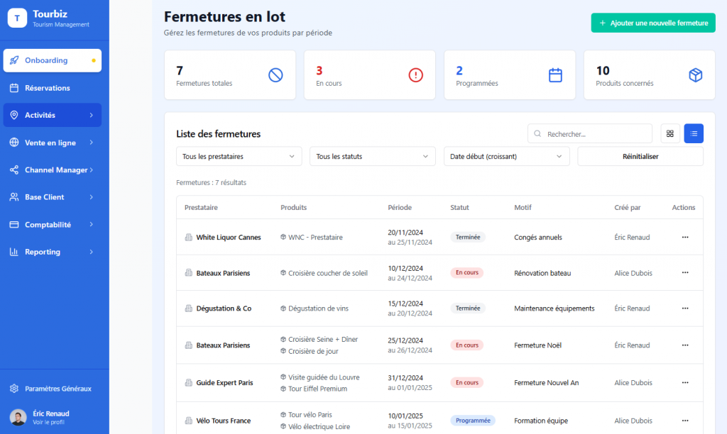 Oui, c’est l’un des gros avantages de Tourbiz. Dès qu’un produit est créé, il est intégré automatiquement dans votre caisse, vos exports comptables, votre facturation et vos rapports. Vous évitez les doublons et gagnez un temps précieux.